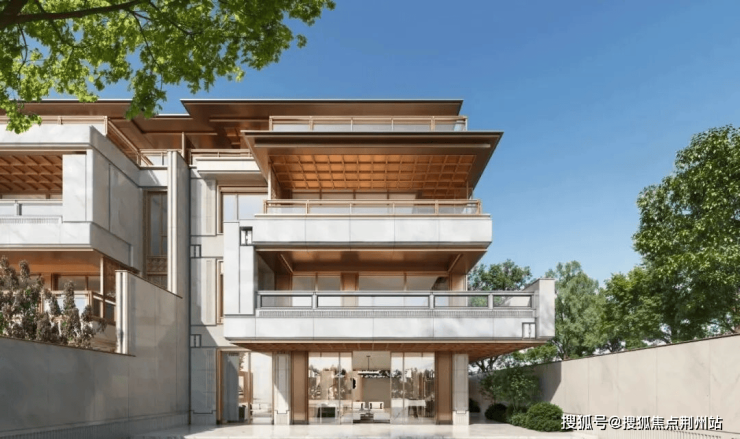 - 台之墅汲取杭州传统园林亭台灵感,造型兼具棱角分明的体量感与圆融的轮廓过渡,进口石材搭配金属铝板的立面组合,以当代材料演绎百年庄园的沉稳高级;