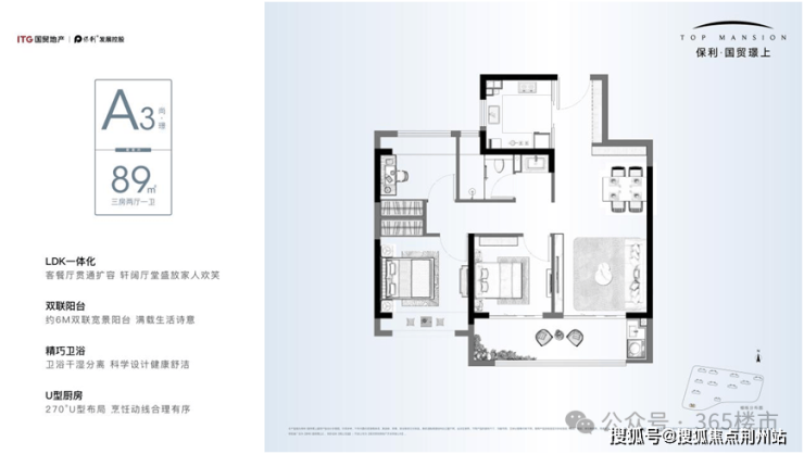 项目89㎡A3中间户采用的大面宽、短进深设计,南向三开间朝南,采光优越;LDK一体化+南向双联阳台+卫生间三段式干湿分离+客厅超大飘窗;完善空间设计,让生活更从容。