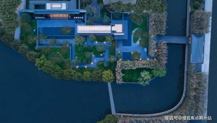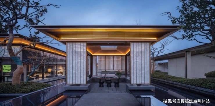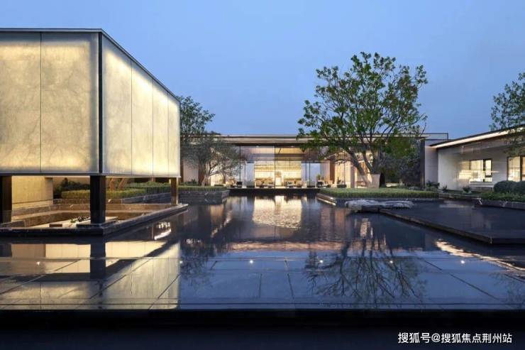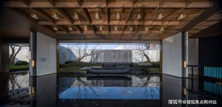 宁波保利·明州瑧悦府水院中的水榭,还做了下沉式设计,当你惬意地坐在这个水榭中,水面恰好与你的头部差不多齐平,这样看出去,这个水院就被无限放大,镜面的水院好似广阔的自然湖面,一切树影摇曳、阳光熠熠都尽收眼底。