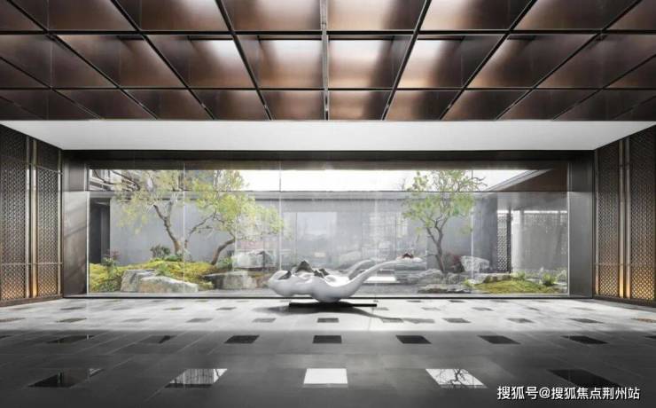 杭州保利·云珹瑧悦府的步行入口,是一座很有东方韵味的门廊。他们在门口摆放的不是大型艺术摆件,而是一条美术馆式的长椅,这样的长椅通常会放在美术馆的传世名画面前。然后你就秒懂了——你面对的是一副画,婆娑的树影与潺潺的泉流,仿佛就是南宋宫廷画师马和之的《古木流泉图》。这样的门廊是让你可以坐下来的——而一旦坐下来,你也就入画了。