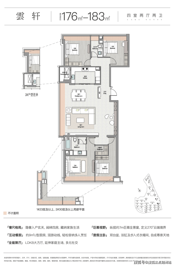 ◆准四代户型设计,实现约93%-103%超高得房率,营造“270度全景舱”、“双主卧奢阔套房”、“LDKB+X无界空间”、“三开间阔绰尺度”等,呈献湖滨美学作品。