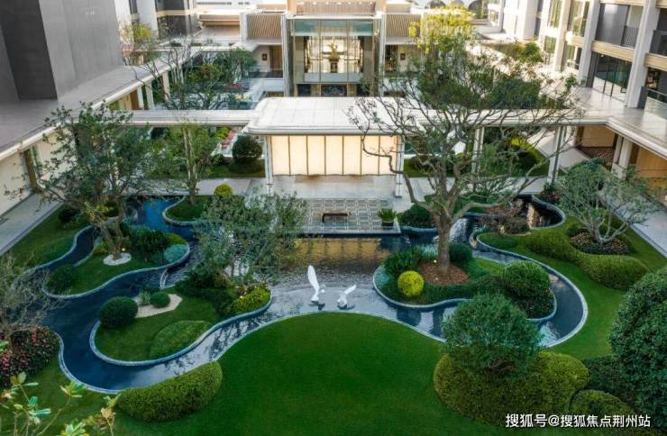 因为锦上观澜是一个大盘,所以整个园区做了三重叠铺景观,其中包含了两重水系,再加上超大会所和全域风雨连廊,这些都是客户从大门到样板间的动线中,能够明显感知到的超配产品。