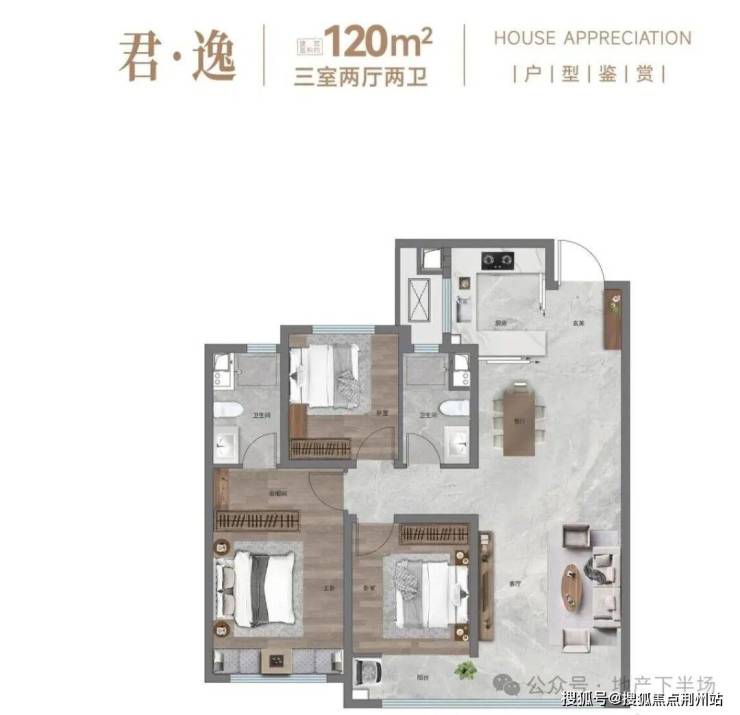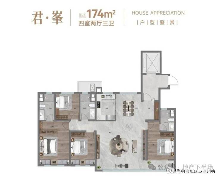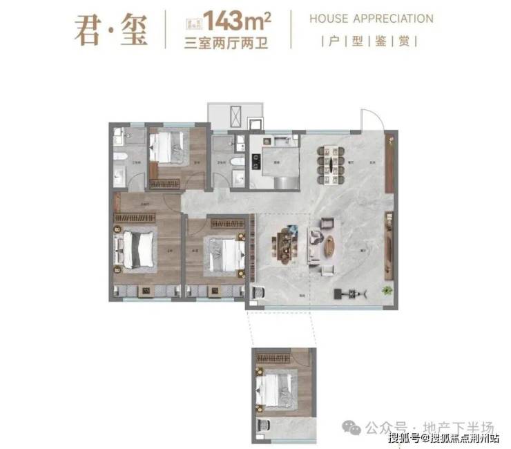 143户型值得单独说一下。现在买房更讲究长期主义,轻易不换房,这也意味着一套房子要满足家庭更长周期的需求。143户型打造了3+X空间,可以有约7米横厅,未来也能轻松多出一间卧室/功能房间。对注重功能性的购房者来说,再合适不过。