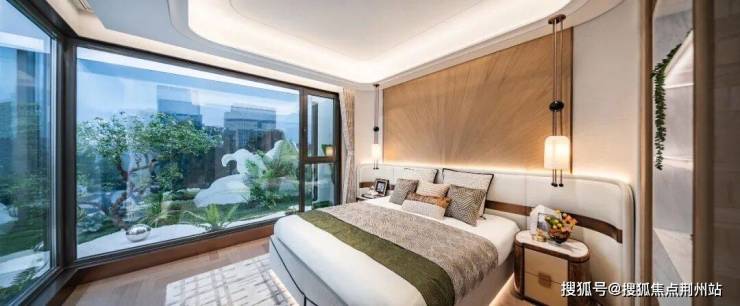 * 套房主卧 尊崇奢享 *酒店式主卧配置独立卫浴与衣帽空间,忙碌一天后回到隔绝世界喧器的静谧天地,私密尊崇,舒适度与仪式感双双进阶。270°转角窗,大幅扩展风景面,如同星级酒店般的超广角观景视野,营造奢适的居住感受。