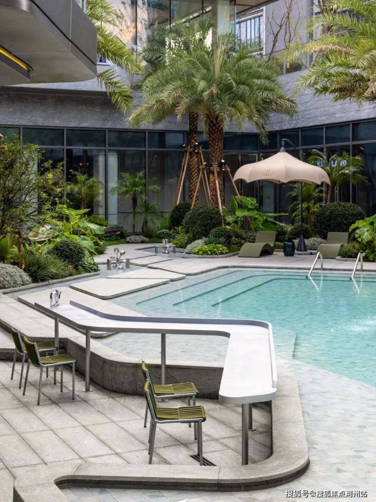 树荫檐下,以原生绿意围合出静谧一隅,成为闲读漫谈的理想场所 ,热带植物、休闲躺椅、艺术卡座相映成趣,水光潋滟间,写就了一幅现代都市中的桃源画卷。