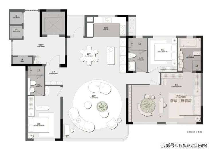 约34㎡奢华主卧套房 | 约16m横向大面宽 | 极简承重墙设计