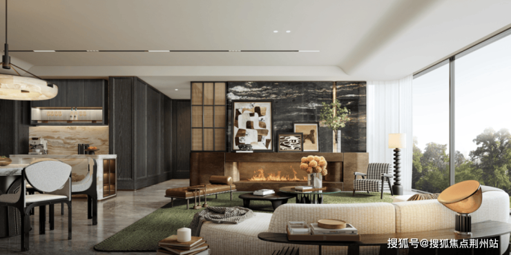 约48㎡横厅景观社交场,餐客厨一体化;270°无界视野,一线尽揽月湖