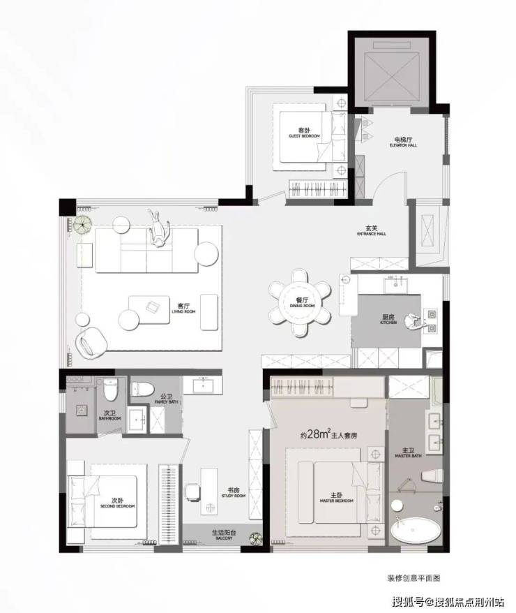 约28㎡奢卫主人阔套+独卫次卧,家族兼享私密起居,主人独享