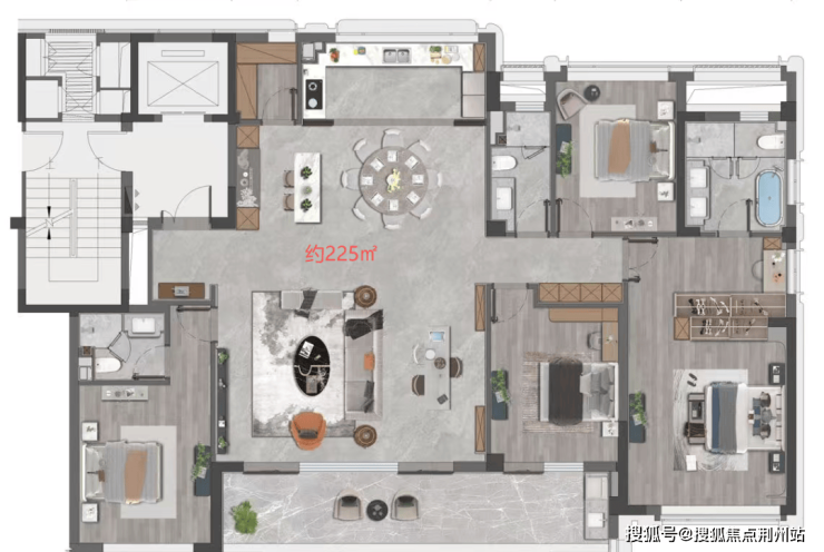 四房两厅三卫,比195㎡多了一个储藏室和一个多功能区。层高约3.15米。