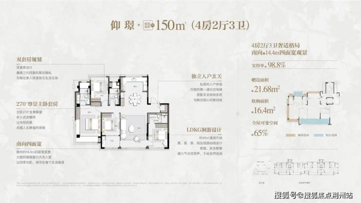五厅格局创新:以近7米面宽横厅为核心,衔接约40㎡南向庭院,创造性地实现社交、休闲、娱乐的功能分离。