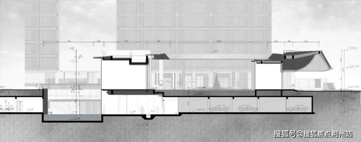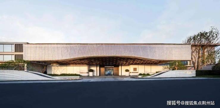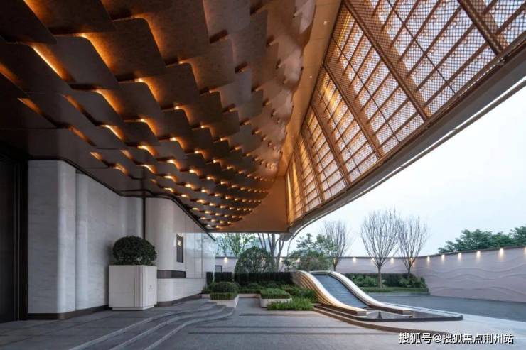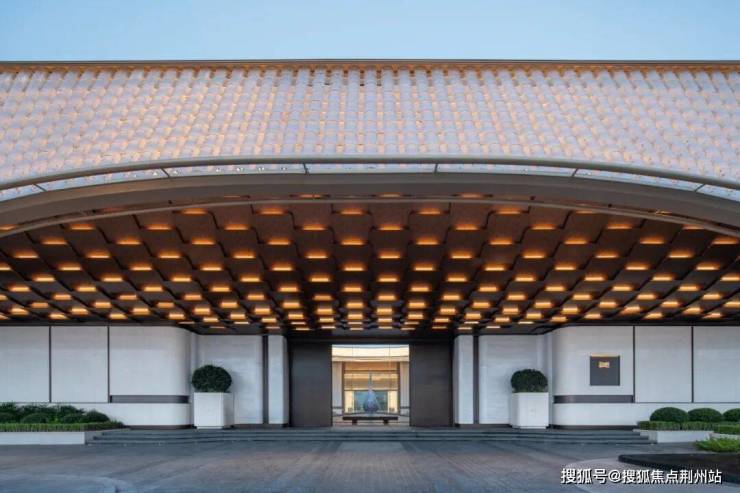 我们借鉴了赫尔佐格和德梅隆(Herzog & de Meuron)事务所设计的京杭大运河博物院所营造出“悬浮的博物馆”的独特效果,在设计时同样考虑入口挑空处理,超50m长横向展开的大门头尺度以涟纹高透水晶玻璃瓦为像素点,利用参数化的辅助设计手法徐徐展开一幅立面水波纹动态画卷。旖旎飘逸的发光屋盖造型犹如开启的鎏金宝盒,在夜晚中点亮一盏归家的暖灯。