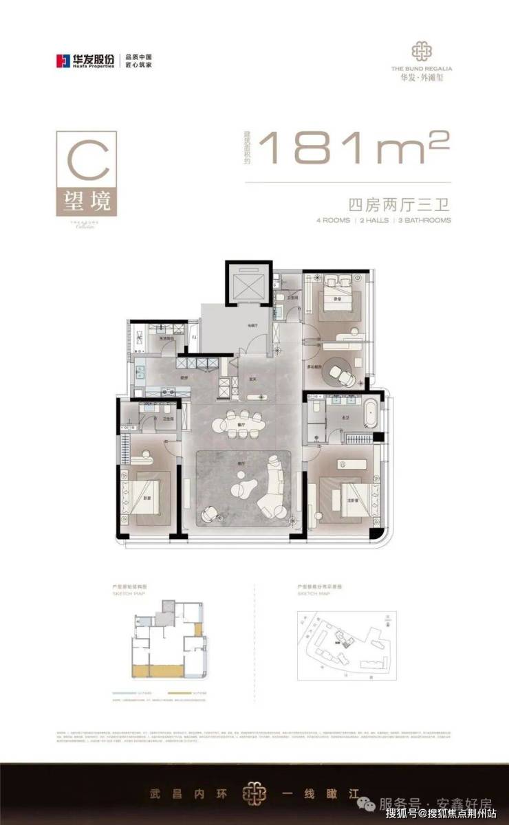 项目采用公建化外立面,搭配极简玻璃幕墙;产品约95-103%综合使用率,阳台、飘窗空间优化;采用环江景布局设计,最大化保留南向观江面,户户皆享优渥视野。
