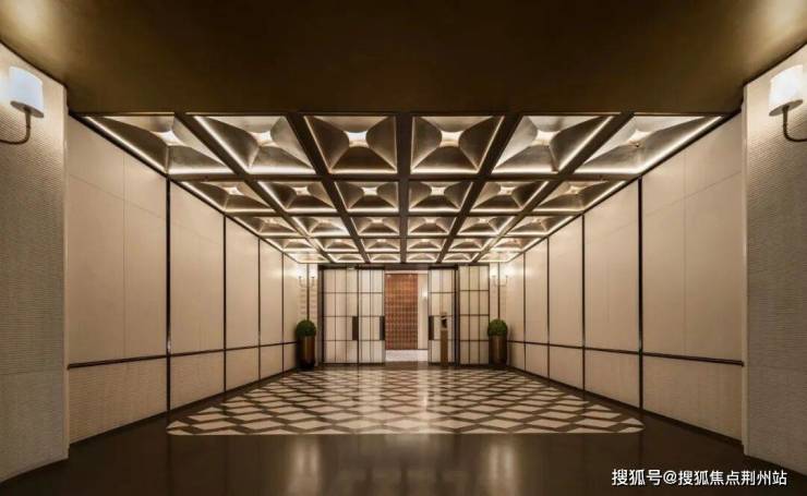 步入门庭,云石吊顶之下,借鉴中国古代建筑中的“藻井”做法,由522片皇家白玉石材拼接而成,凝聚光华,辉映时空。华光之下,中心水池承托起艺术雕塑,莹润皎洁,宛若珍宝。