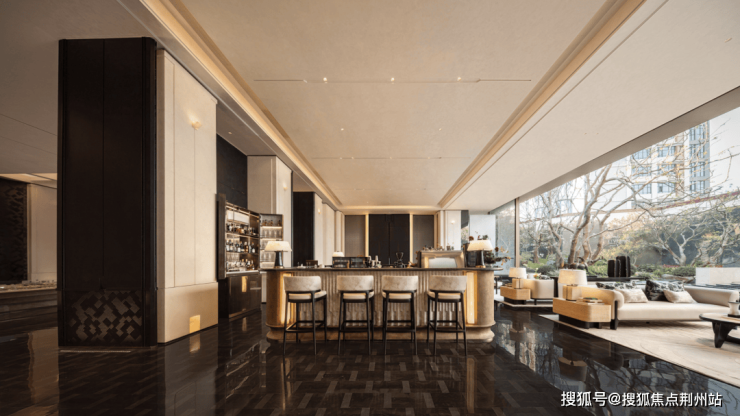 “社交会客厅”更成为艺术与奢石的交响盛宴,静湖春晓与银河金奢石的水吧台,对望下沉庭院美景,天气好时巨幅玻璃移门可全部打开,带来室内外一体化的舒适体验,场景几乎能超越上海所有的奢华酒店。