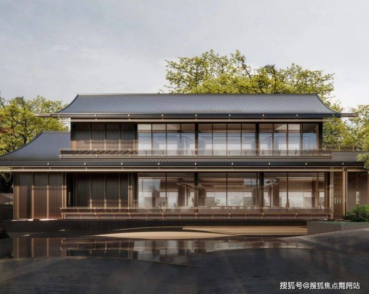 整栋建筑屋身层层飞檐、基座漂浮架空,巨幕玻璃立面,非常飘逸灵动。