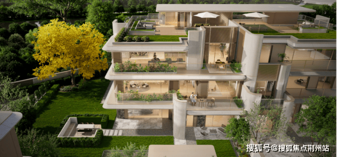 【层层退台花园一户三面景观】双拼别墅建筑以梯田式退台结构呈现,每层均配置私属空中花园,每一户独享三面花园地性景观;