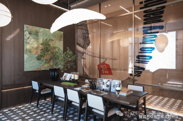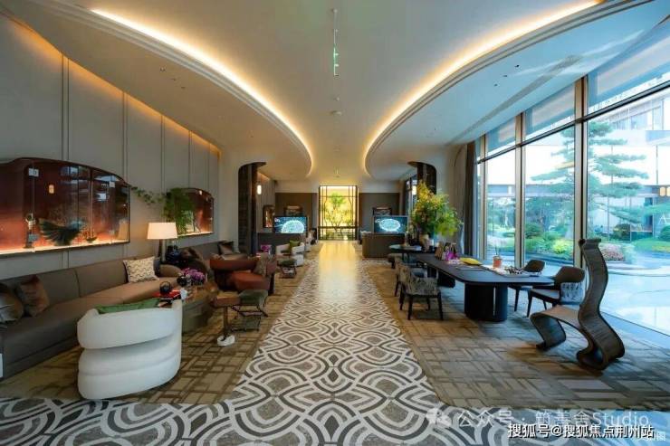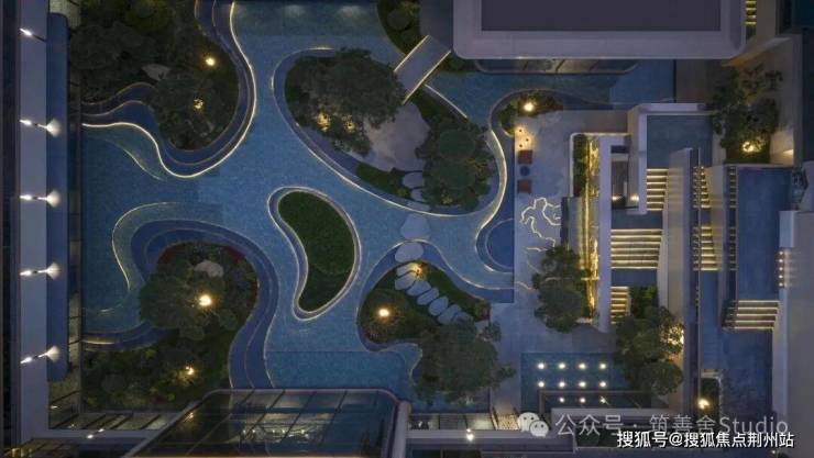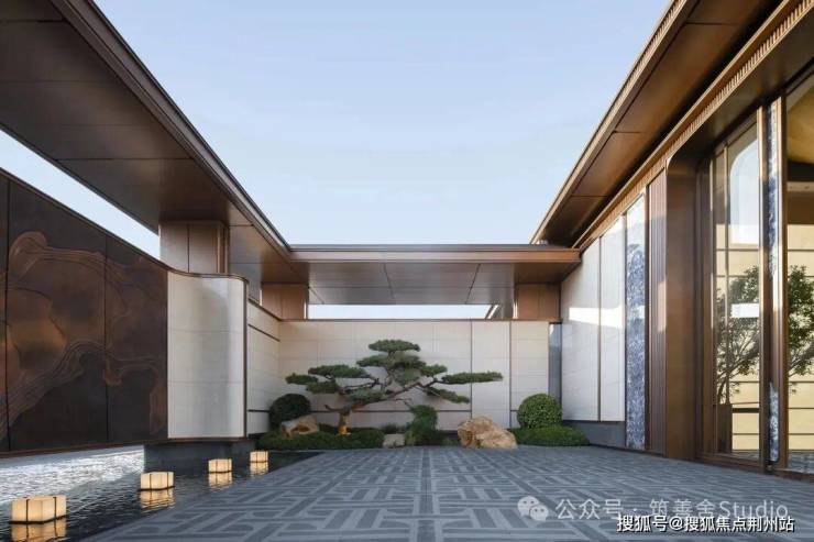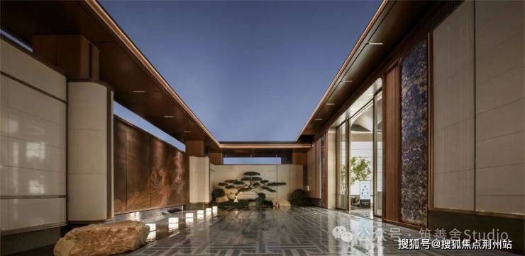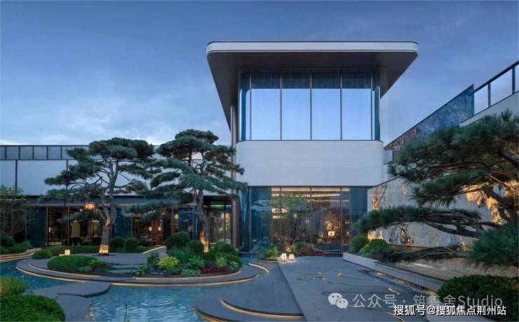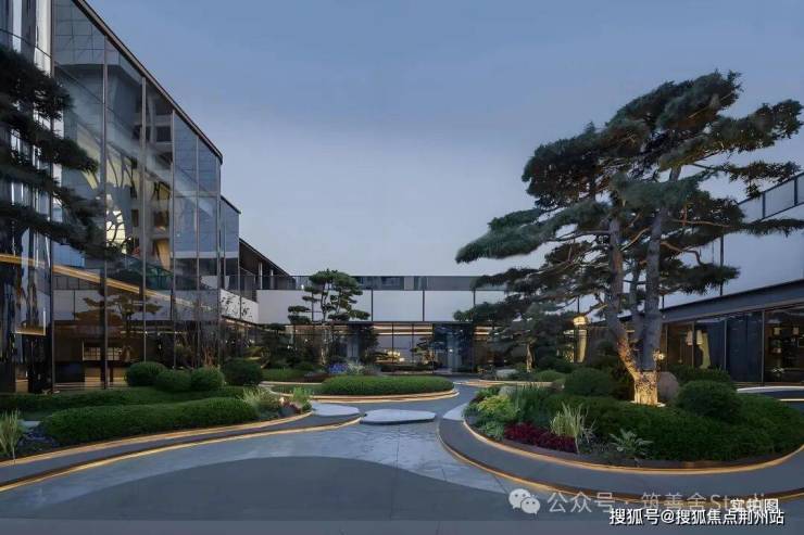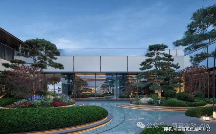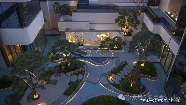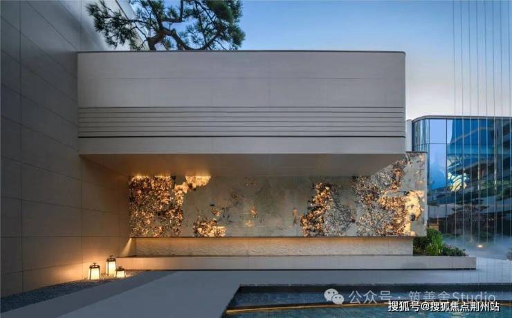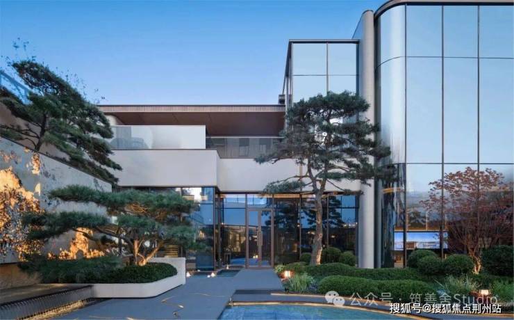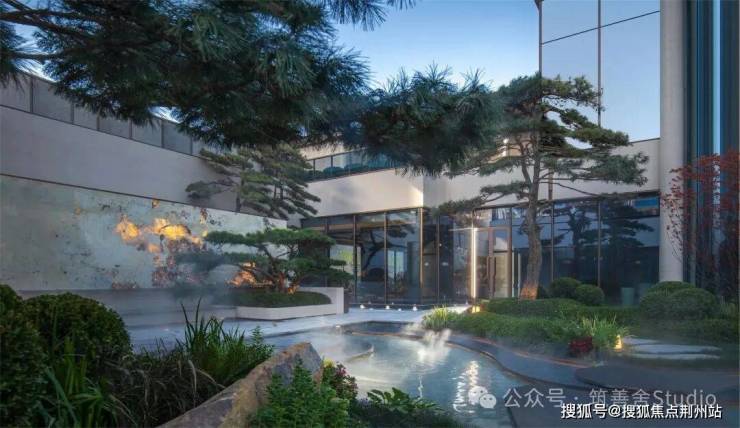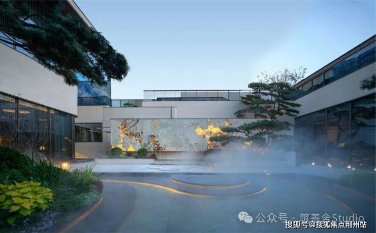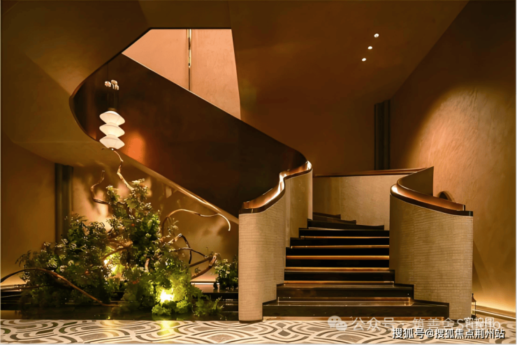 沿着入口庭院,循阶而下,[九曲云间] 下沉庭院豁然呈现。这里是“自然静谧”设计理念的极致演绎,也是黄河文脉的微缩映照。飞虹挂瀑处,潘多拉透光跌水景墙流光溢彩,悬挑水幕将玻璃建筑掩映成“流动的水晶宫”;九曲松韵水系蜿蜒,复刻黄河湾流走向,十株甄选劲松扎根其间,每一株皆诉说着基业长青的家族传奇;铸信天阶旋梯,复刻茶马古道雄风,嵌入古币形制艺术吊灯,既呼应兰州“丝路重镇”的历史底蕴,又暗合世代传承“一诺千金”的风骨。