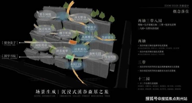 空间礼序上打造两条仪式景观轴,三带生活轴,形成有序的空间结构,礼序分明,层次清晰。通过合理的功能分区,打造八个自然生活花园,确保了居住、休闲、健身等不同功能的和谐共存,满足了居民多样化的生活需求。