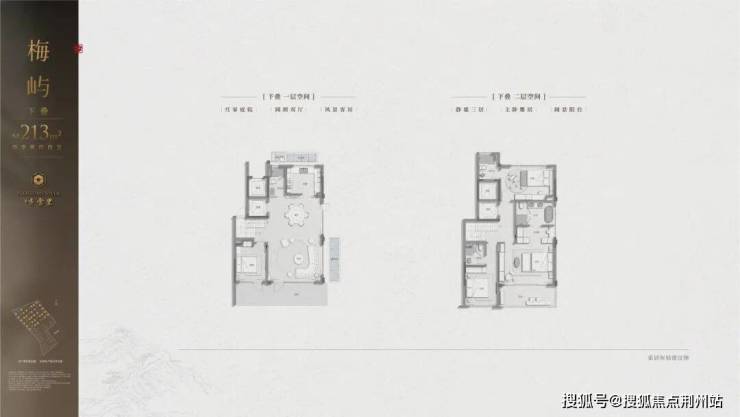 建筑立面:古今交融的诗意表达:外立面以香槟金铝板为基调,搭配蓝眼睛石材与玻璃幕墙,融合传统歇山重檐、纳福悬鱼等元素,既保留宋式建筑的对称美学,又赋予现代建筑的轻盈通透。合院组团采用三面庭院设计,L型景观面与环绕式檐廊,将超山梅影、丁山湖光引入每一扇窗景!