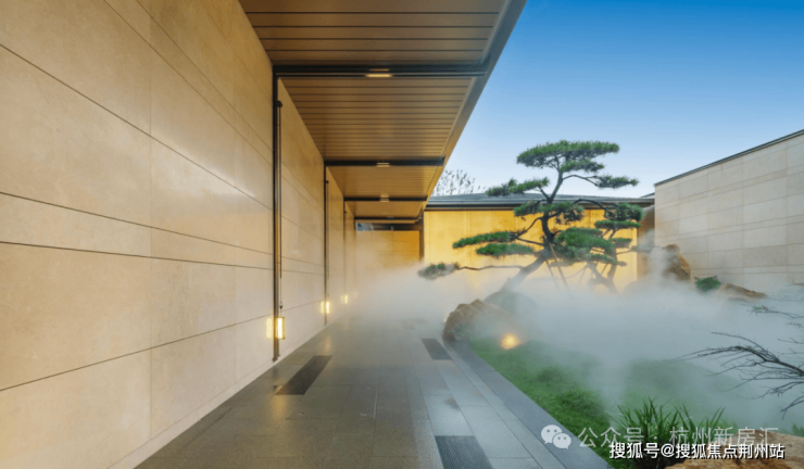 一进社区大门取意宋代二坡顶形制,透光奢石立面与沉木米黄景墙横向延展,古朴肌理与苍劲造型松形成“石木对话”。二进廊下庭院还原《万壑松风图》意境,松林阵列与精工格栅构筑风骨场景。