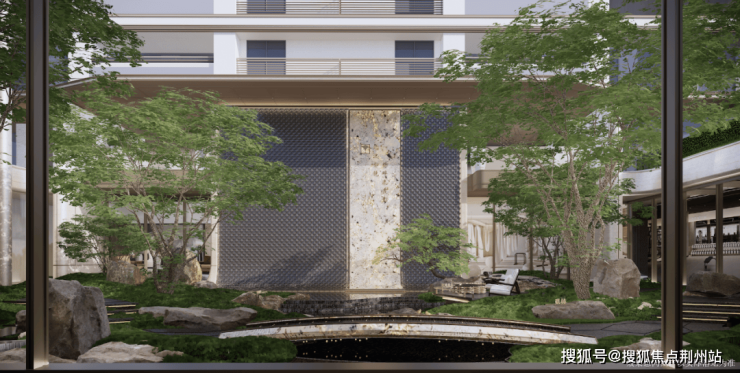 其中,涛影流金·下沉式庭院,撷取黄河第一湾之“形”,一座石桥静卧清波之上,叠瀑循阶而下,流水淙淙,庭中每株乌桕独立成景,让业主收获归家如入园的感受。