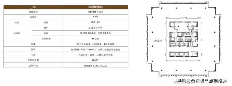 建筑高度230米,12米挑高大堂,9.6米柱跨,层高4.2米,18部电梯,标准层建面约2150㎡,获得绿色建筑与LEED金级双认证。