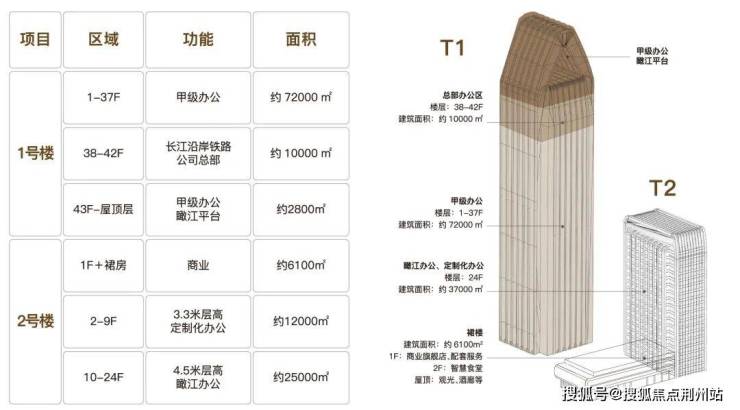 【产品概况】:项目由1栋5A甲级写字楼(T1)、1栋瞰江生态办公楼(T2)、少量裙楼商业组成,地上计容面积约为12.5万㎡,其中1号楼8.1万方,2号楼3.7万方,商业0.6万方。