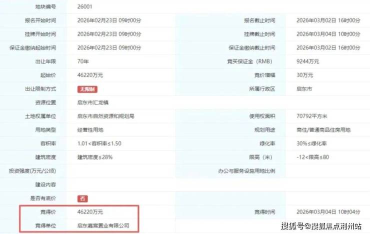 启东26001地块成功出让,由民企启东嘉宸置业有限公司以总价46220万元竞得,成交楼面价约4353元/㎡。
