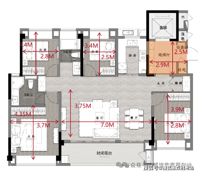 户型本身的设计也是比较优秀的,非常的方正,并且是3+1开间朝南,采光面充足。