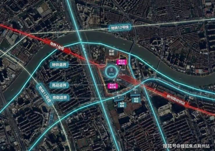 基地制约条件较多,地铁1号线从场地正中穿过,2#、3#、4#住宅楼均位于地铁盾构安全保护区内(距盾构16-30米);沿苏州河需按高宽比1:1退界;高层住宅自身南北间距需不小于南侧建筑高度的0.5倍;且需满足冬至日满窗日照1小时的要求。面对多重限制,设计以“一叶四星”布局巧妙应对,三栋44-49层超高层与一栋16层高层住宅高低有序、错落排布,充分利用沿街临河优势,沿苏州河方向呈阶梯状递退,使各住宅单元获得差异化的景观朝向。