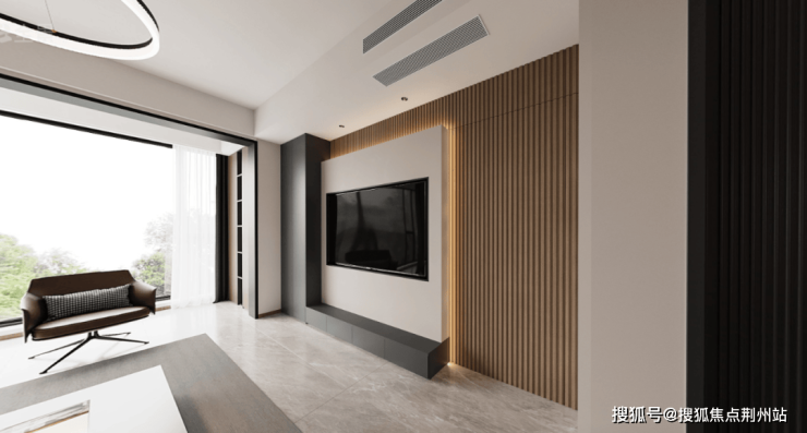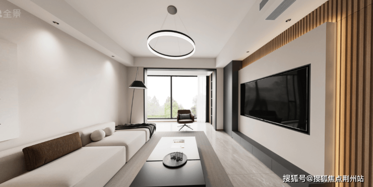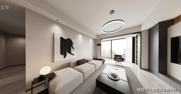 客厅在装修方面以虚大面积底色留白为基调,为的就是可以让空间显得更为干净;通过流畅线条的运用,让线其成为空间层次与比例的调配者,色彩于留白中的点缀,丰盈空间的层次和细节之美。