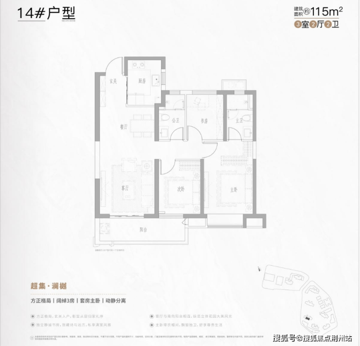 该户型位于11、12、13号楼中间户,三开间朝南,北部房间对连廊,私密性、采光有一定影响。该户型南向大阳台,主卧带飘窗,有一定优化面积。该户型动静分区明确,主卧带独立卫生间。