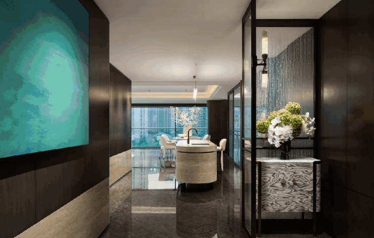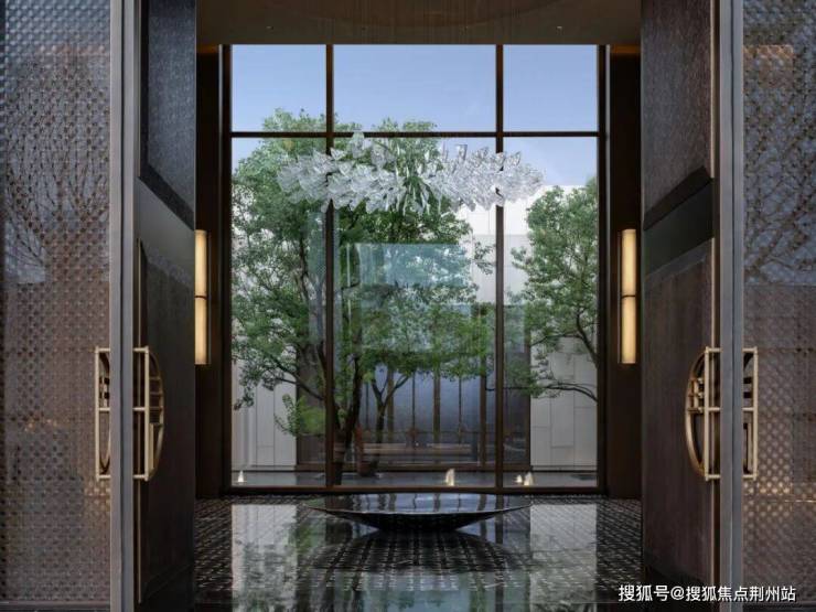 整扇大门采用铜艺精雕,以水波为纹理,两侧夹丝玻璃融入了中国传统吉祥纹“方胜纹”,演绎雅贵的隐奢。近500㎡的环岛落客前庭奢阔大气,港湾环抱式的入口景墙以及酒店式门厅,让每一次归家都能感受到高门大户的尊崇礼遇。
