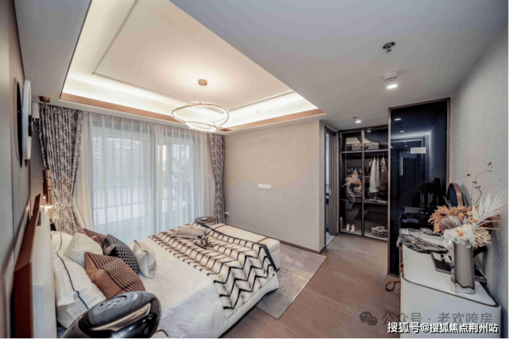约24㎡的超大主卧套房,开间达到了约5m,配备了步入式衣帽间和南向三分离卫生间,功能齐全,尺度奢阔,堪比星级酒店的奢适享受。
