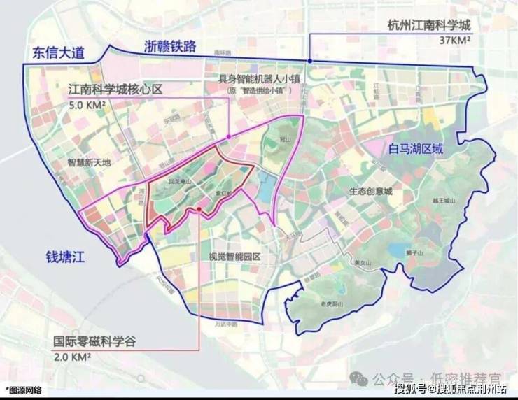 •生态创意城:生态生态创意城核集聚了北航杭州创新研究院、白马湖实验室、量子传感大楼、海康实验室、浙工大网安院等高能级创新平台,吸纳了网易、华数等数字文化企业,是杭州江南科学城“科产城人文”融合的典型。