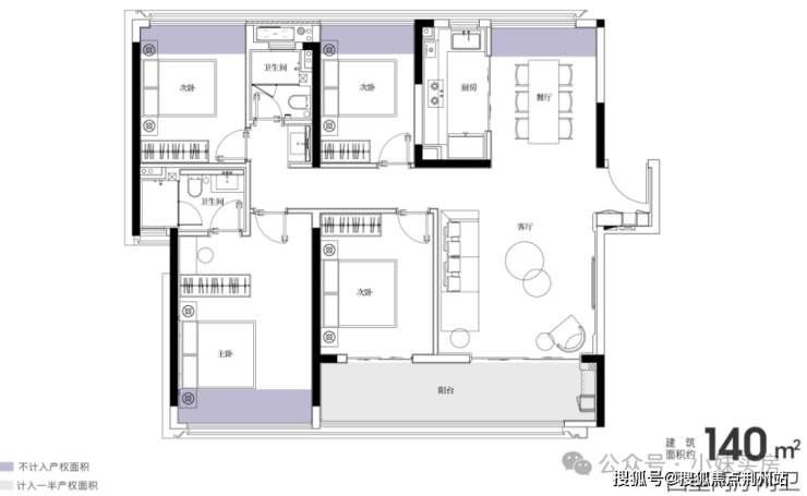 140㎡四房两厅两卫:这个户型功能上偏改善,全部大落地窗配置,客厅与阳台打通,视野通透,主卧采光充足,厨房预留双开门冰箱位置, 小不足是落地窗玻璃未带隐私防护,需自行处理隐私问题。