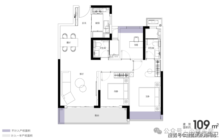 109㎡三房两厅两卫:格局比较方正,三开间朝南,客厅与次卧连通大阳台,通透性还不错;独立玄关兼顾收纳与隐私,主卧配备独立衣帽间及卫生间,适合小年轻或者三口之家,遗憾是次卧面积略紧凑,摆放1.5米床后剩余空间不多,做儿童房可能要精简家具。