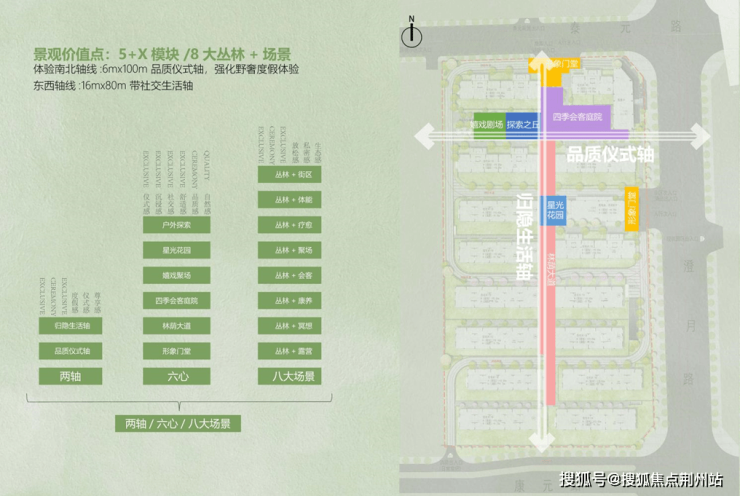 本项目以”双轴联动、核心聚场”为景观设计理念,构建”一横一纵”的景观骨架体系: