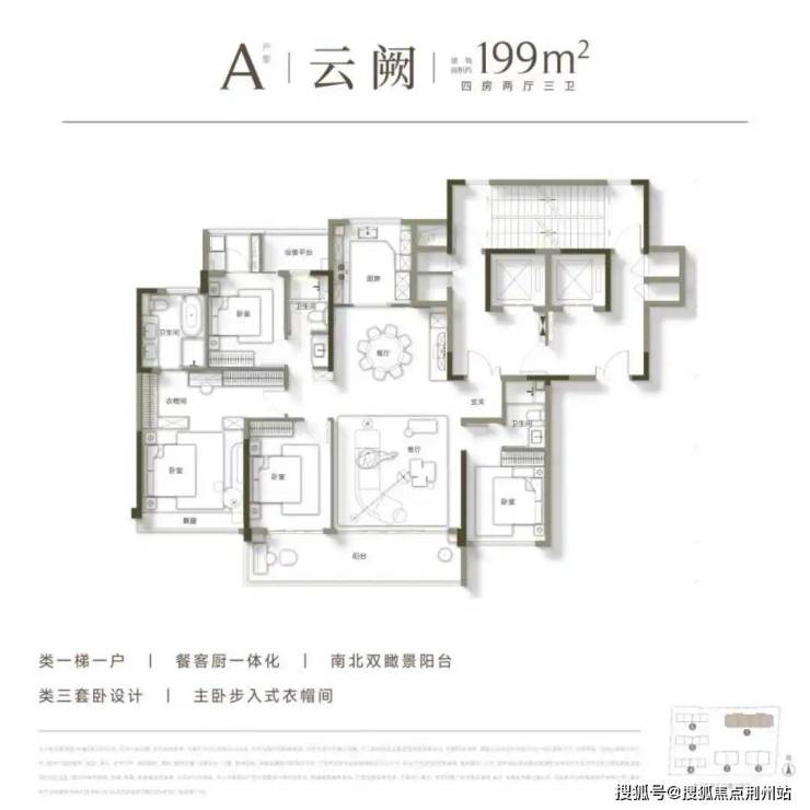 首开(建筑面积约)199㎡A户型,四房两厅三卫设计,拥有豪华双套卧+南北双阳台,甚至每户还赠送储藏室,据说实用率高达92%。