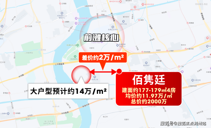 先看与前滩核心二手房的差距。前滩二手市场看似均价15-16 万/㎡,但这基本是小户型的水平;真正稀缺的大户型,成长性早已拉开差距,普遍站到18万+/㎡。像晶耀名邸 150+㎡4房,挂牌价超19万/㎡,总价直逼3000万;九宫格的三湘项目,挂牌价更是达19-25万/㎡的高位。