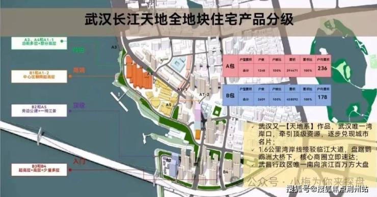 武汉长江天地规划总建面约160万方,B是住宅,A是商业。其中一期B4地块长江天地珺廷规划用地面积约3.2万方,总建面约19.1万方,容积率约4.23,建筑密度约23.7%,住宅总户数836户,地下机动车停车位1237个,套均建面约162平。首开的是B4地块珺廷,