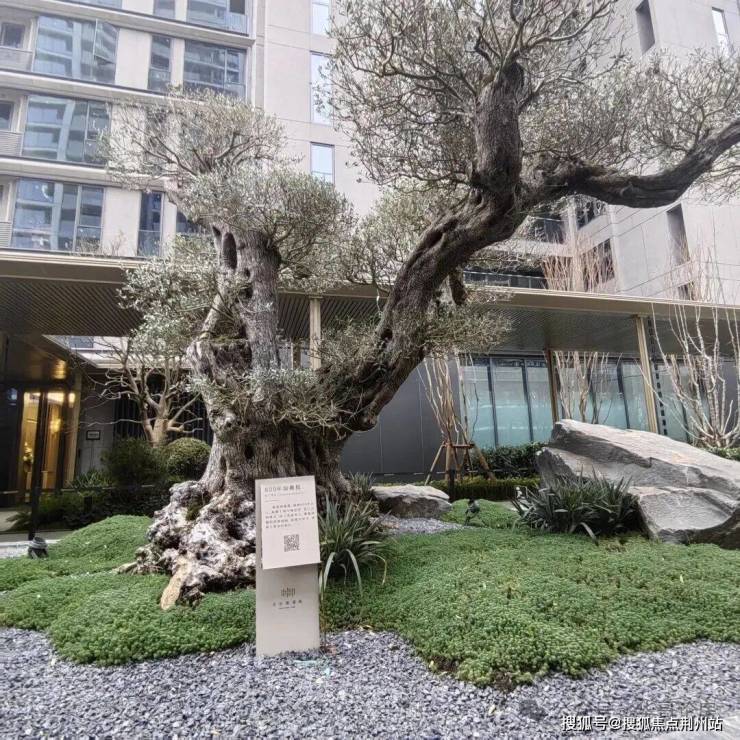 这边是一片台地花园,种植了随季节变化的各种树木,据售楼部介绍,有90年树龄的广东铁冬青、价值50万元的造型羽毛枫、乌桕树,据说这是一棵600年树龄的西班牙油橄榄。
