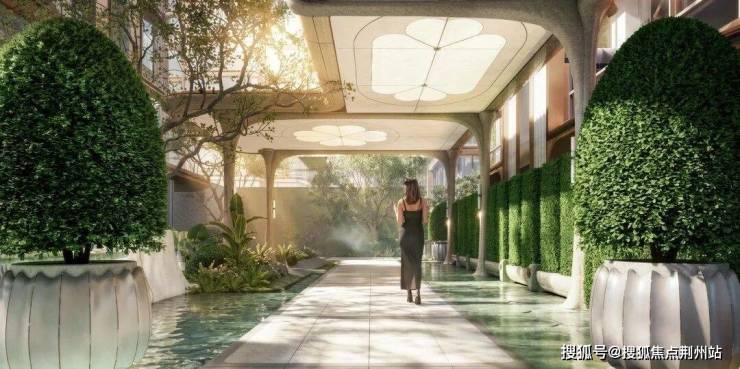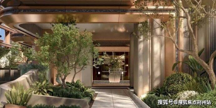 项目在抬板设计之余,还利用抬升形成的台地空间,来打造下沉式庭院,通过叠水、绿植的搭配,形成立体景观,这种一步一景的沉浸式森系园林,进一步体现项目自身森系园林景观。