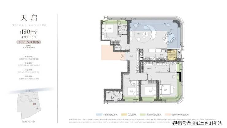 ④180㎡户型:四房两厅三卫,客厅、北向次卧拥有非常不错的看江视野,并且客厅可以270度观景;另外,东头这一户型的生活阳台、主卧套房也可以看江,观江面更大。但东头户型离3号楼较近,低楼层采光可能有所影响。