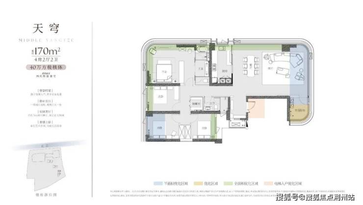 ③170㎡户型:四房两厅两卫,整个户型的布局与江面基本平行了,对比3号楼另外两个户型,170平户型的看江效果要优秀不少,客厅(270度观景)、主卧、主卫、厨房这几处空间都拥有不错的江景视野,观景面还是比较可观的。不过为了看江,这个户型的进深做的比较大,通透性稍显不足。
