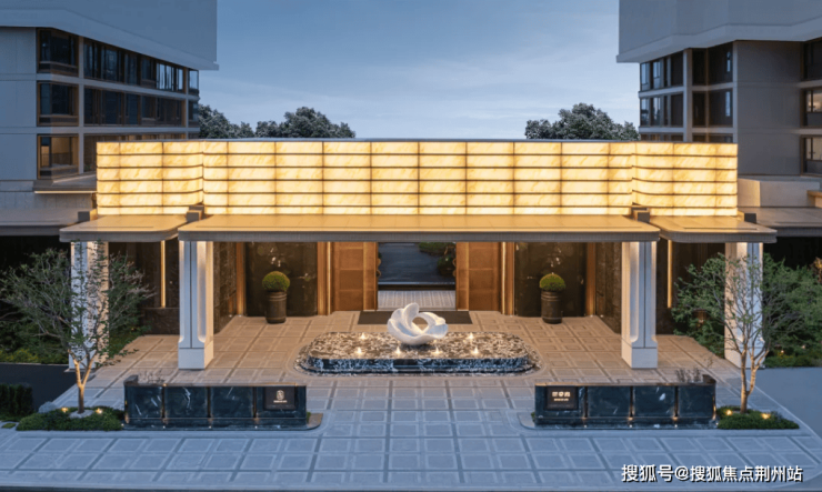大门主入口以珠宝设计为灵感,打造宽约66米,高约10.6米的仪式门头,三段式透光云石吊顶,四根芬迪白奢石,呈现出对称美学,尽显瑰丽大宅风。
