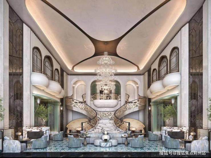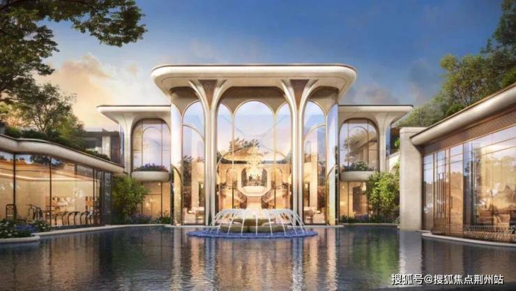 约60m艺术殿堂级门廊+重檐庑殿顶+宝格丽穹顶,门口两棵80年的古松......这种空间的恢弘营造,或许是当下华中豪宅的顶配。