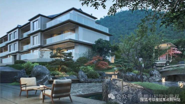 社区依临平山脉走势,整体北高南低。景观中轴结合宋画中的巨瀑、山石、花木、溪流、花池,抬地地形营造出淡然内敛的游园体验。