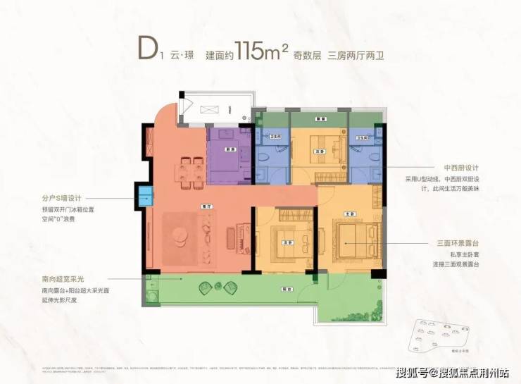 保利·国贸璟上即将上市1#的四代宅产品,主力户型为建面约99㎡和115㎡三房两卫,每户都拥有较大的露台,采用错层设计,开创燕子矶全新生活方式。