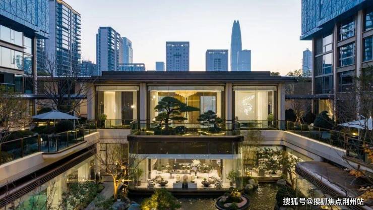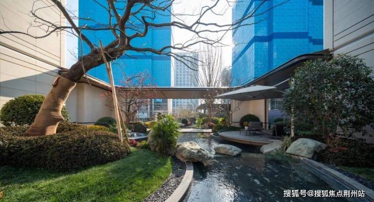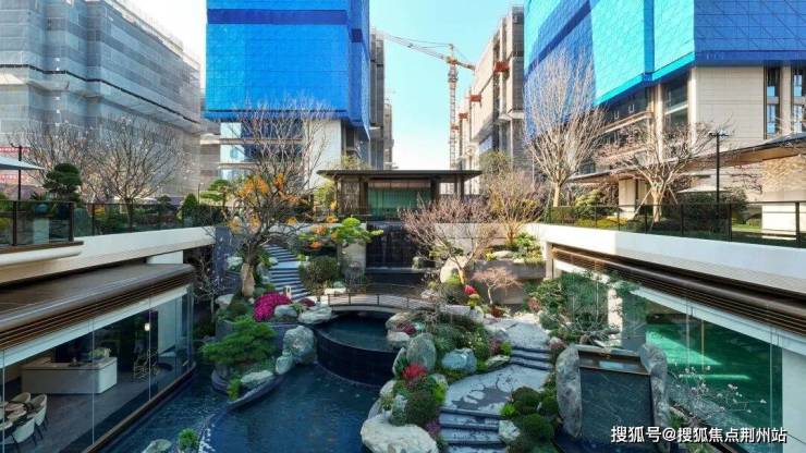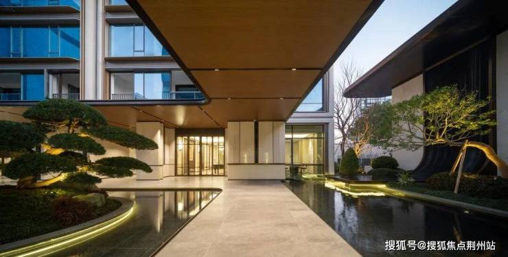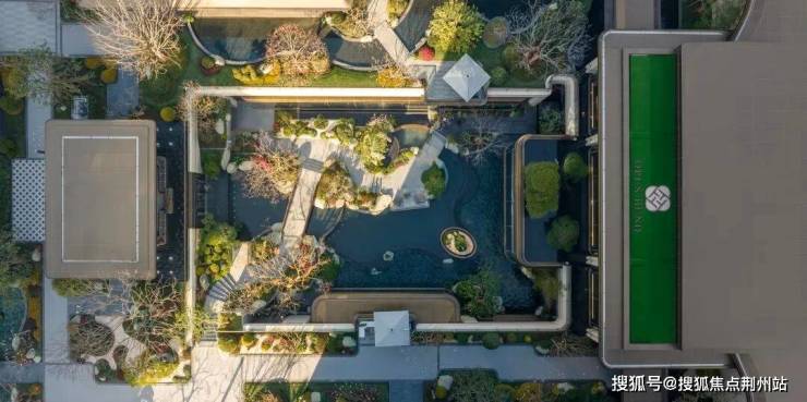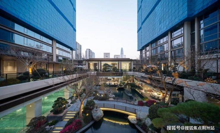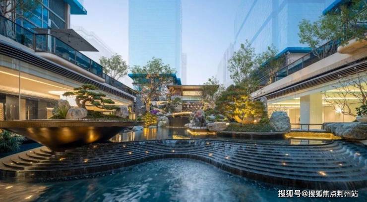 这座下沉式庭院,把臻元府最具IP特色的水景景观,发挥到极致。《兰亭集序》里曲水流觞的场景,《望庐山瀑布》里疑是银河落九天的飞瀑……各种水景串联起九大私境花园、五重摩登森境,犹如安缦式隐奢酒店,带给业主度假风和松弛感。